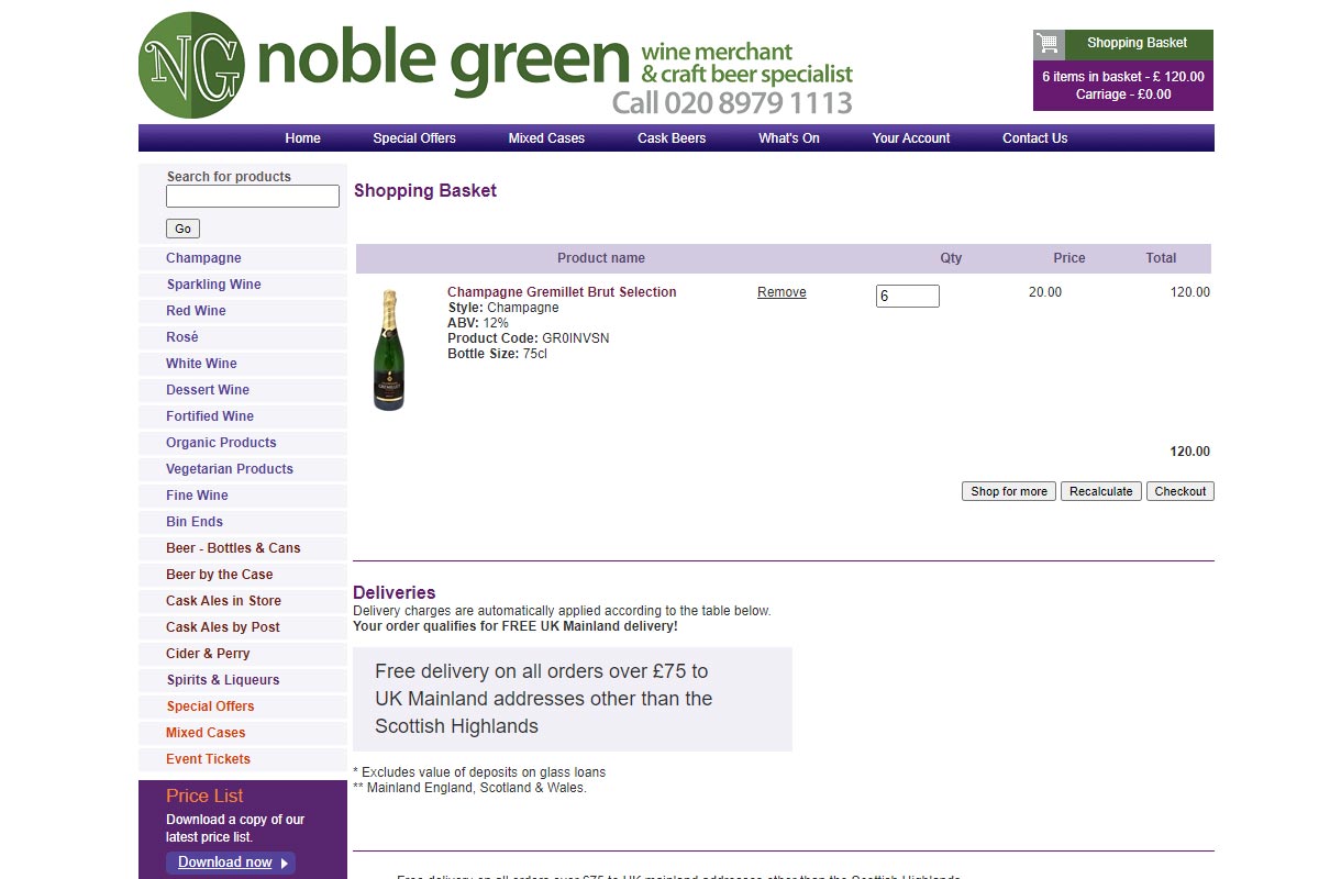 Noble Green are a London based award winning wine, spirit and beer retailer, specialising in high quality products and service. We were tasked with designing and building a custom e-commerce platform to move their business online.