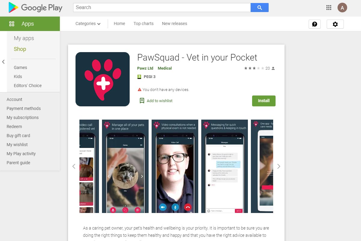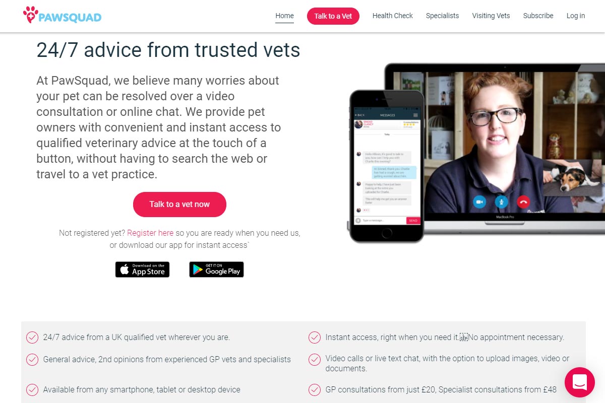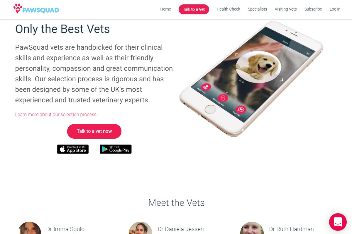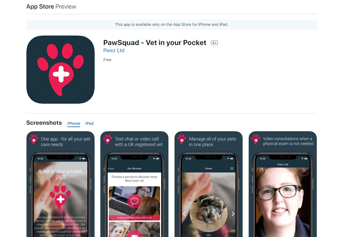 Pawsquad are the UK' first telemedicine company for pet owners. Pet owners with sick animals can use Pawsquad's website and app to speak to a video via a video call or text chat and get help for their pet.